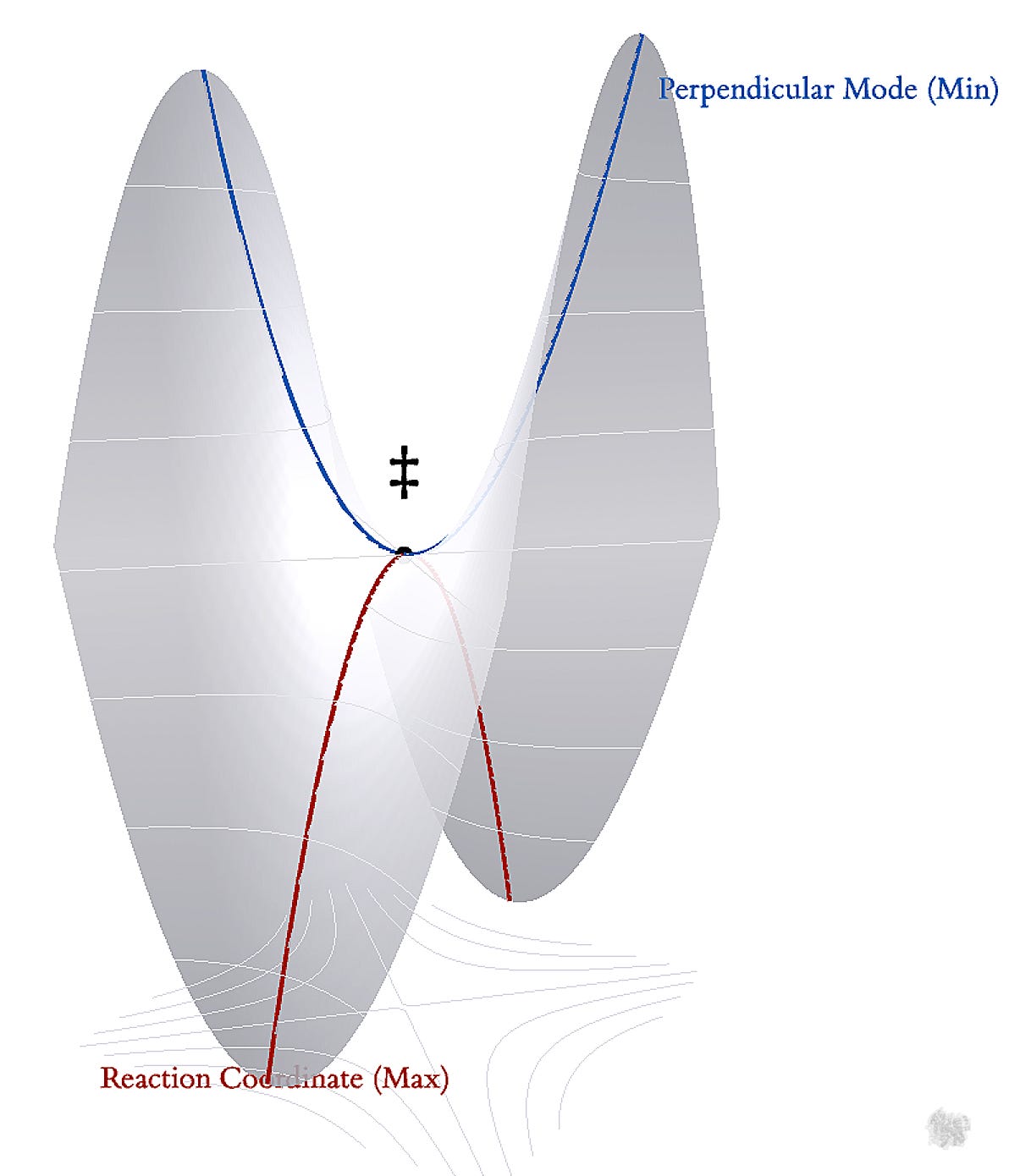 Thornton modeled the transition state as a geometric saddle point, defined by two opposing types of curvature. The reaction coordinate mode represents motion along the reaction path; because the transition state is an energy maximum in this direction (like the top of a hill), the curvature is negative (yielding an imaginary frequency). Conversely, the perpendicular mode represents motion orthogonal to the path; because the transition state sits at the bottom of an energy valley in this direction, the curvature is positive (yielding a real vibrational frequency).