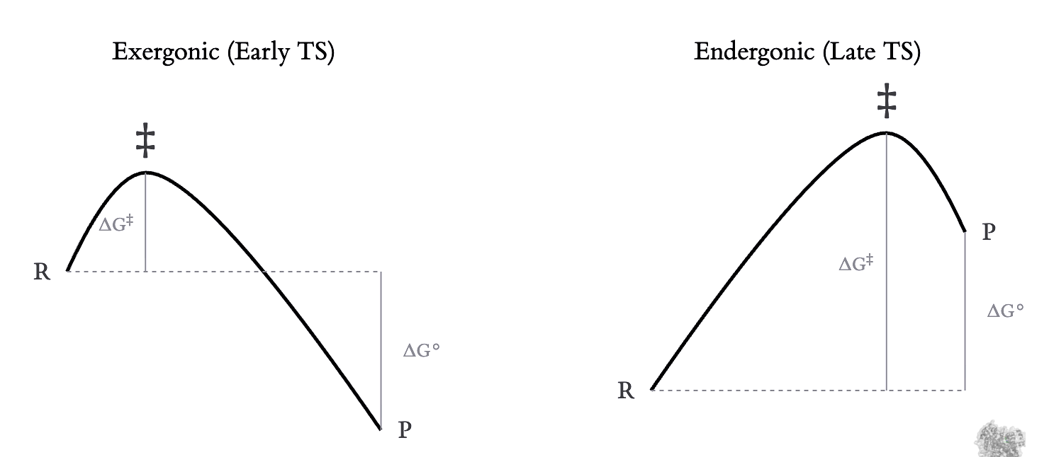Imagine a ball balanced on the peak of a hill (the TS). If you raise the plateau on the reactant side (making reactants less stable, reaction more exergonic), the peak effectively shifts closer to the reactant side. This means making the reaction more exergonic leads to earlier TS and making it more endergonic shifts it to a later TS.