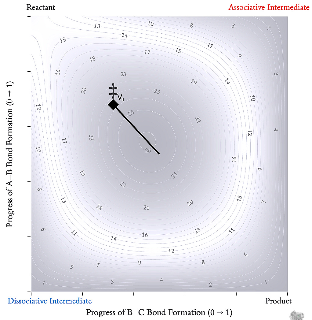 This 2D representation converted the “reaction path” from a line into a vector on a plane. The transition state was no longer a fixed point on a fixed line; it was a saddle point that could drift across a surface defined by the two independent bond coordinates.